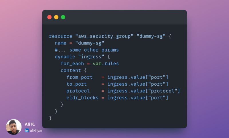 we tell Terraform using the dynamic keyword what block we want to replicate, which is in this case ingress. then we assign our variable to loop through; and for content, Terraform implicitly provides an ingress object which we access its values with the value keyword. The object name matches the dynamic argument ingress.