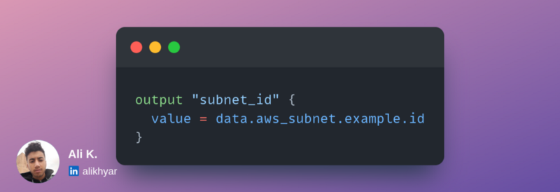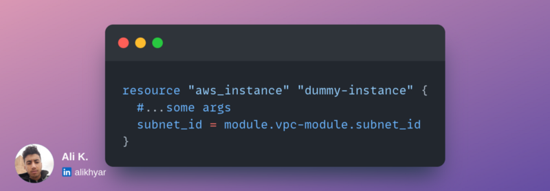 Looking at the snippet above, you should know that an output named subnet_id is defined inside vpc-module module: When referencing module outputs we always start with module keyword. In the already seen snippet: