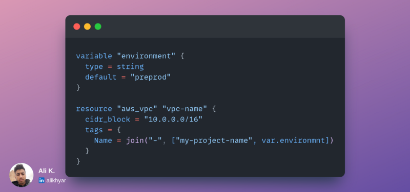 The delimiter in the above snippet is a hyphen - and the element between brackets are strings that we will concatenate, which will result in the string my-project-name-preprod .