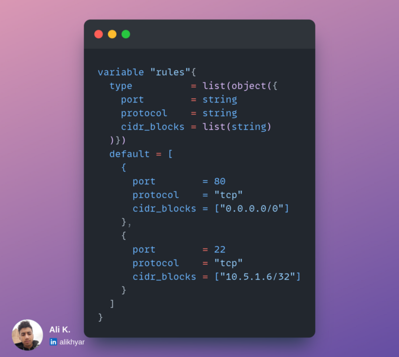 as the ingress rules add up, the security group will be hard to manage, and the code doesn't look beautiful as well, a way to clean the above code is by using the dynamic blocks. First, we can extract the data from ingress blocks into one variable that looks like this: